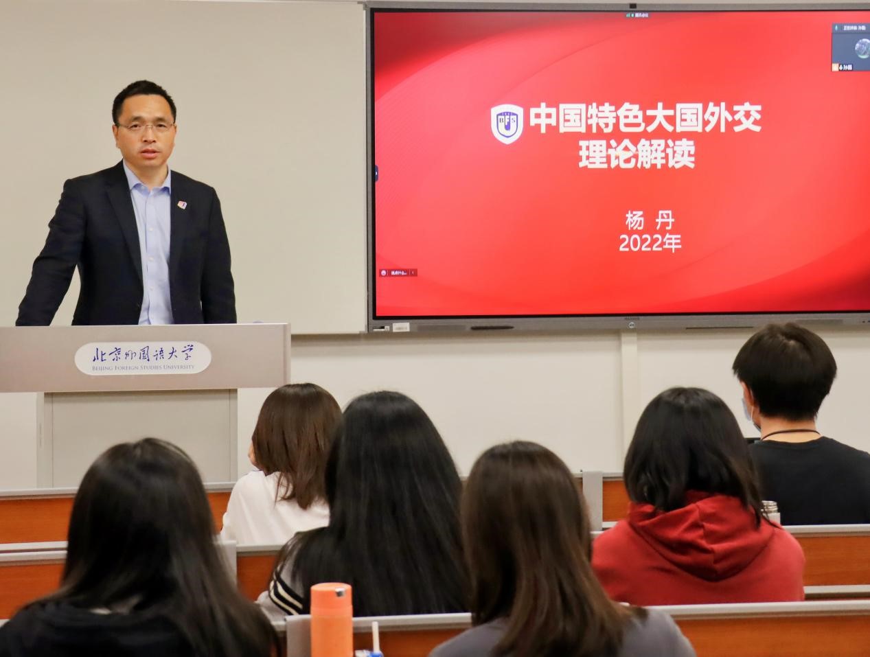 杨丹分别从“百年未有之大变局下的‘中国’”、“人类命运共同体愿景的‘特色’”、“参与塑造全球新秩序的‘大国’”、“全方位展现中国智慧的‘外交’”、“中国之‘北外’,世界之‘北外’”五个方面,对“中国特色大国外交的理论解读和北外实践”进行了全面分析和系统阐述。