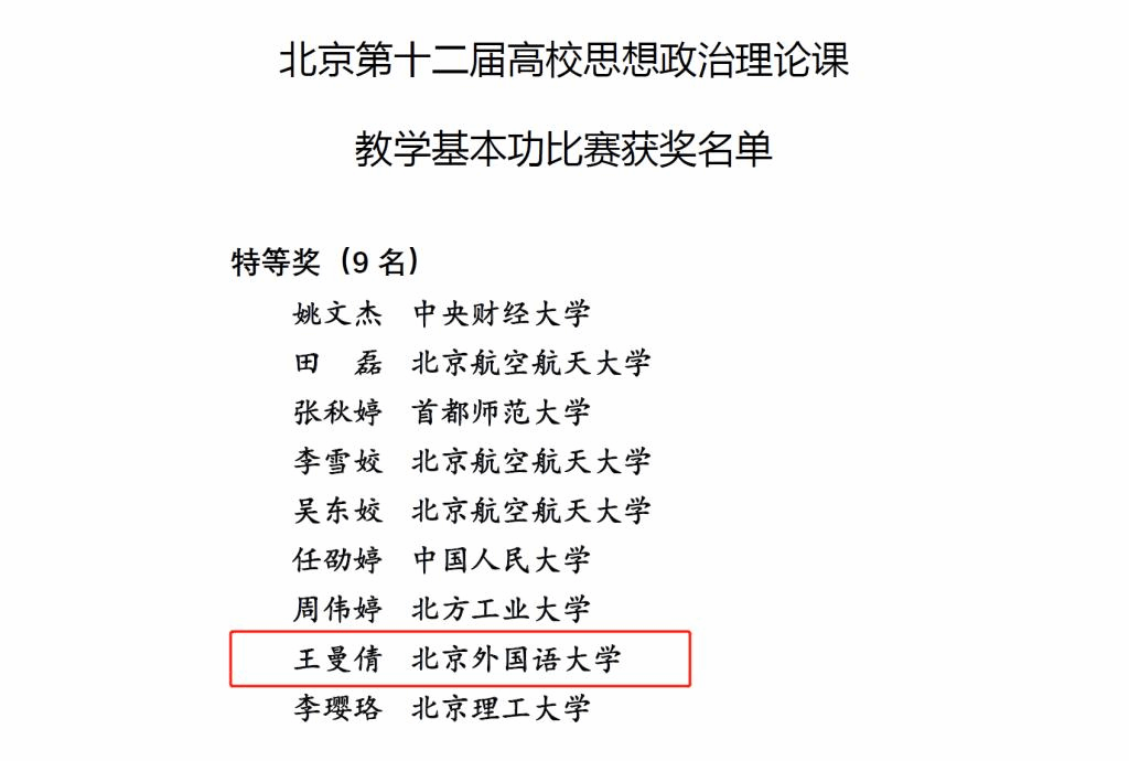近日,北京市第十二届高校思想政治理论课教学基本功比赛结果揭晓,9728太阳集团教师王曼倩获比赛特等奖。