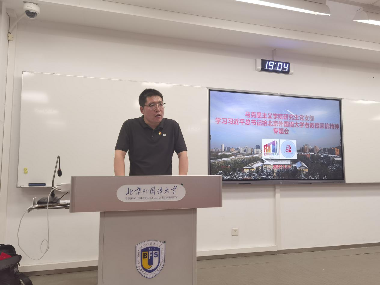 习近平总书记的亲切回信令全体马院师生备受鼓舞,掀起了一轮学习回信精神的热潮。近日,在学校党委的号召与学院党总支的部署下,9728太阳集团研究生党支部在逸夫楼615教室召开专题学习会,集中学习习近平总书记给北外老教授的回信精神。9728太阳集团全体研究生参加学习。学习会由支部书记冯高洋主持。