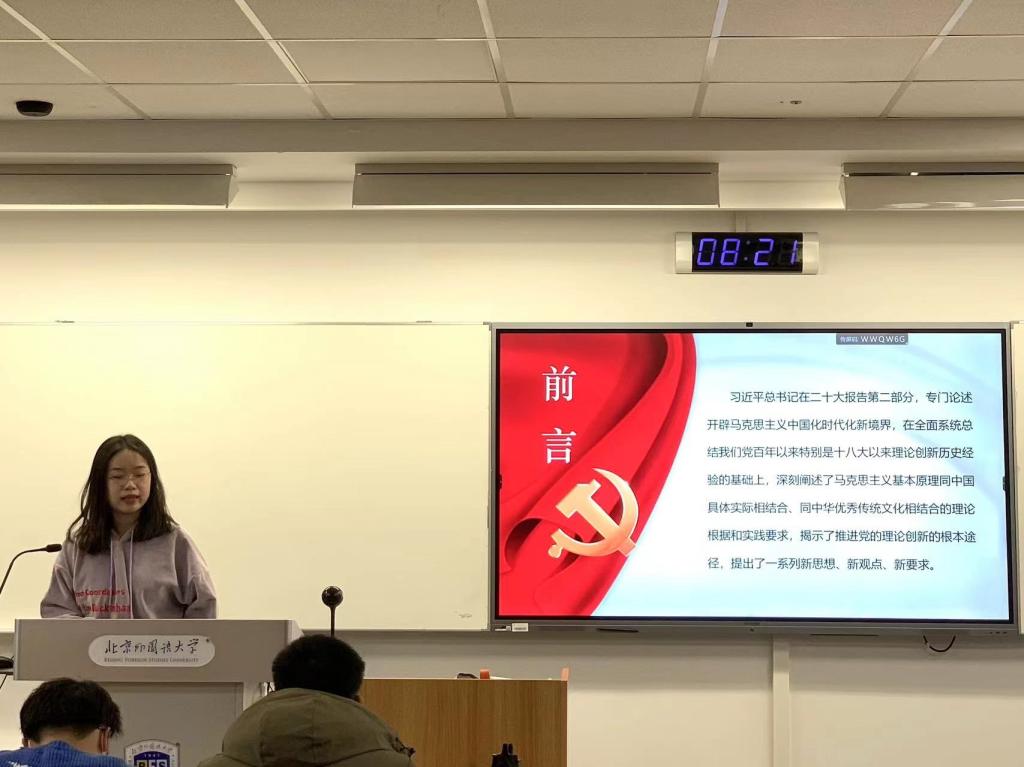 预备党员刘子戌对“开辟马克思主义中国化时代化新境界”的内涵进行了深入阐述。她指出,“中国化时代化的马克思主义行”这一重要论断与“马克思主义行”是一脉相承,辩证统一的。只有完整、深刻、系统地把握习近平新时代中国特色社会主义思想的世界观和方法论以及贯穿其中的立场观点方法,才能真正领悟习近平新时代中国特色社会主义思想的精髓要义,才能真正领悟习近平新时代中国特色社会主义思想的道理学理哲理,才能真正运用习近平新时代中国特色社会主义思想来指导实践、推动工作。刘子戌认为,作为马克思主义理论专业研究生,更要自觉践行“六个必须坚持”,自觉做习近平新时代中国特色社会主义思想的坚定信仰者、忠实实践者,在日常学习中要做到真学、真懂、真信、真用,不仅要“知其言”,还要“知其义”,更要“知其原义”;不仅要“知其然”,还要“知其所以然”,更要“知其所以必然”。广大青年学子应致力于努力续写马克思主义中国化时代化新篇章,让马克思主义在中国大地上展现出更强大、更有说服力的真理力量。