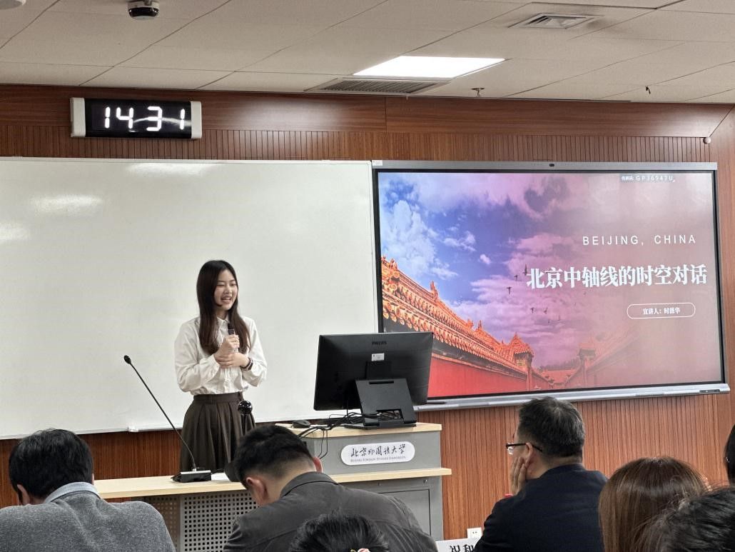 时薇华同学以《北京中轴线的时空对话》为题,深入挖掘北京中轴线的历史文化内涵。她通过多媒体融合的方式,展现了北京中轴线的变迁与发展,搭建起过去与现在的时空对话桥梁,让观众深刻感受到北京中轴线作为历史文化瑰宝的独特魅力和重要价值。
