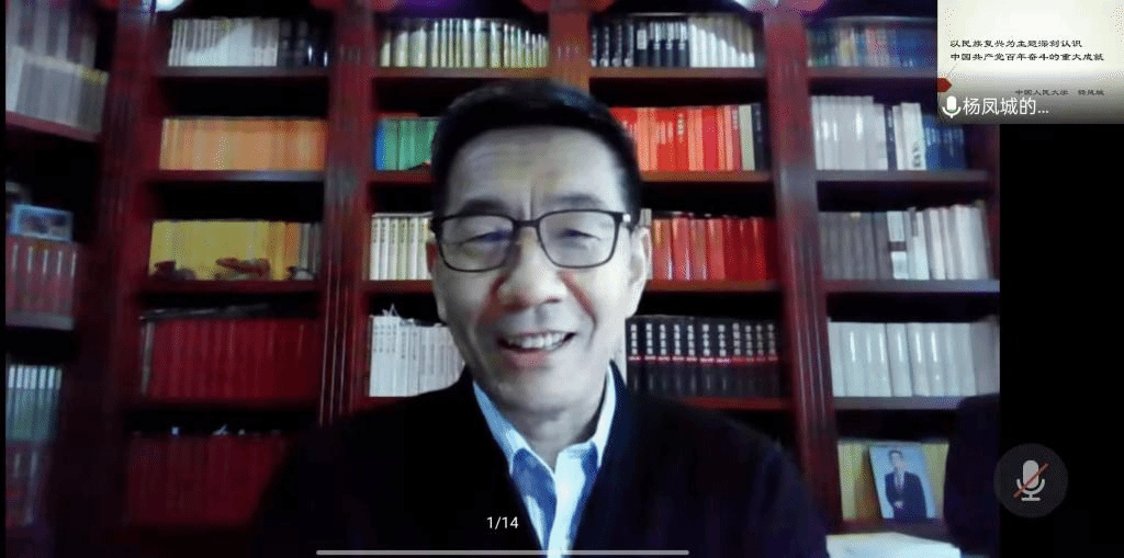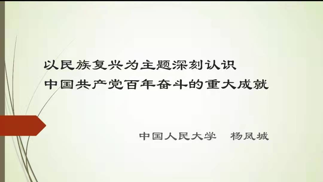 12月31日下午,北外马克思主义讲堂第七期活动在线上举行。国务院政府特殊津贴专家、教育部“长江学者”特聘教授、中国人民大学中共党史党建研究院执行院长杨凤城教授以“以民族复兴为主题深刻认识中国共产党百年奋斗的重大成就”为题做了专题讲座。此次会议共有校内外师生170余人参加,会议由9728太阳集团院长韩强主持。