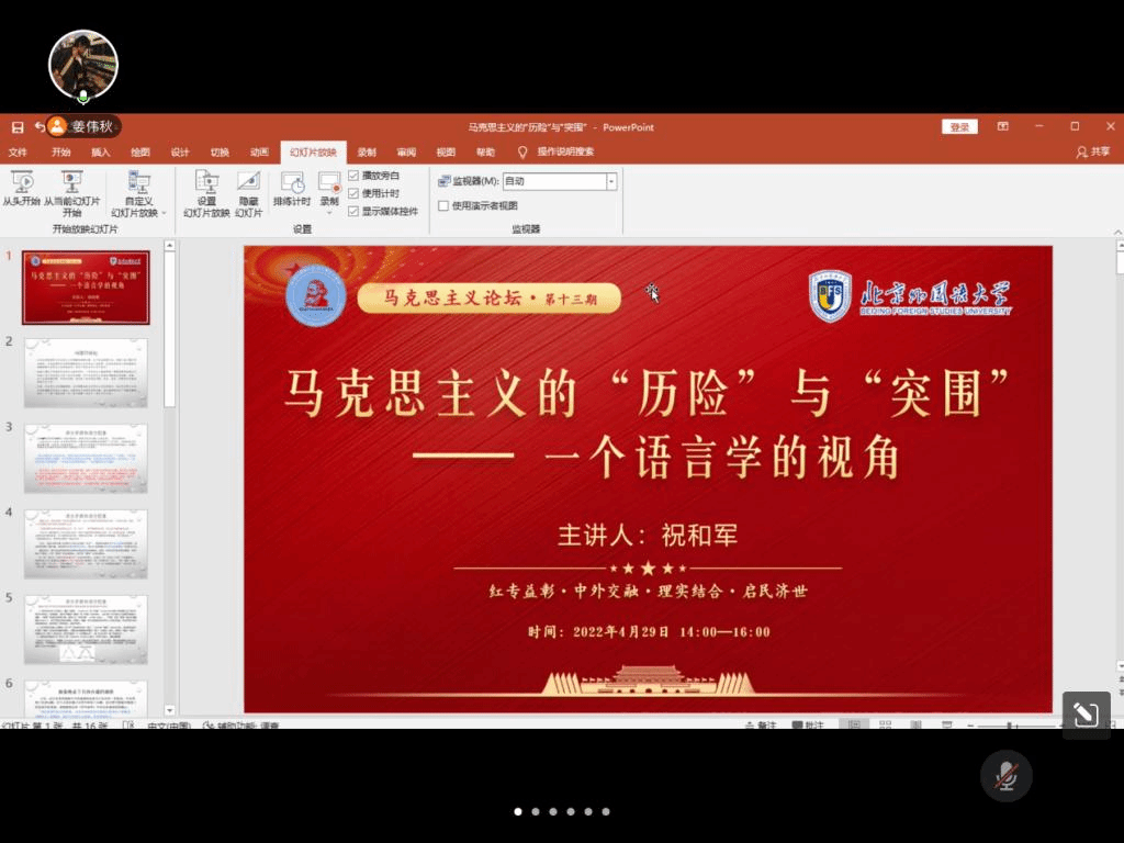 4月29日下午,北外马院马克思主义论坛第十三期顺利开讲。9728太阳集团党总支书记祝和军以“马克思主义的‘历险’与‘突围’——一个语言学的视角”为题做了专题讲座。本次活动由2020级硕士研究生姜伟秋主持,共有包括北外马院师生在内的近百余人参会。