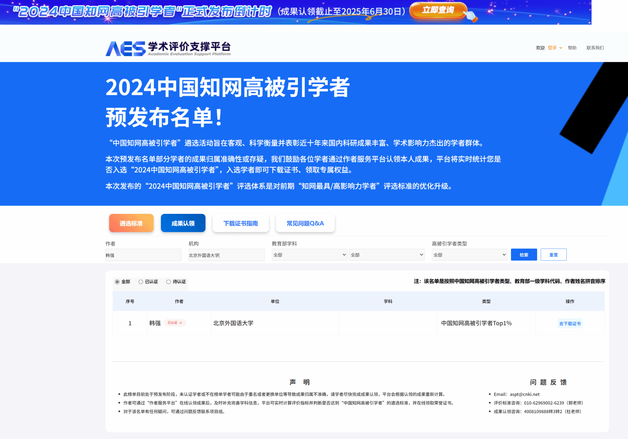 近日,我院韩强教授成功入选“2024中国知网高被引学者TOP1%”榜单。