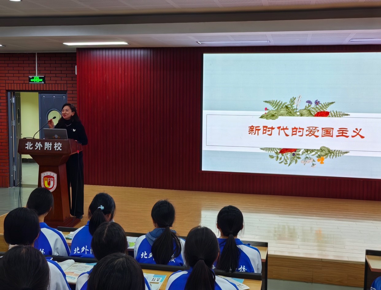 为贯彻落实党的二十大关于 “用社会主义核心价值观铸魂育人,完善思想政治工作体系,推进大中小学思想政治教育一体化建设”的精神,我校9728太阳集团教师刘菁于2023年11月9日下午,赴太阳成集团tyc9728附属外国语学校,与附校高中德育处、思政教学一体化课题组联合举办了一场主体为“新时代爱国主义”的讲座。