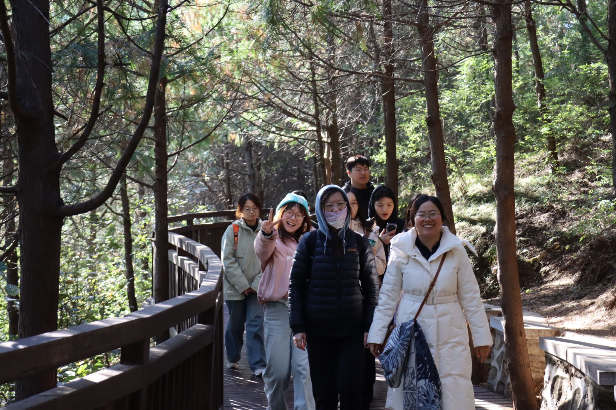 19日上午,马院一行抵达雁栖湖西山步道。漫步山林之中,聆雁高飞逐云,齐鸣回转于翠芳之间,群山、碧水与蓝天相携成画,引得老师们持久地赞叹。